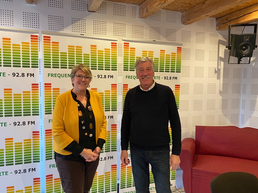 Dans les studios de Fréquence Verte, Anne Eichwald et Bernard Bamberger, respectivement président(e) de Gambsheim Animation et du Comité de fête de Monswiller…